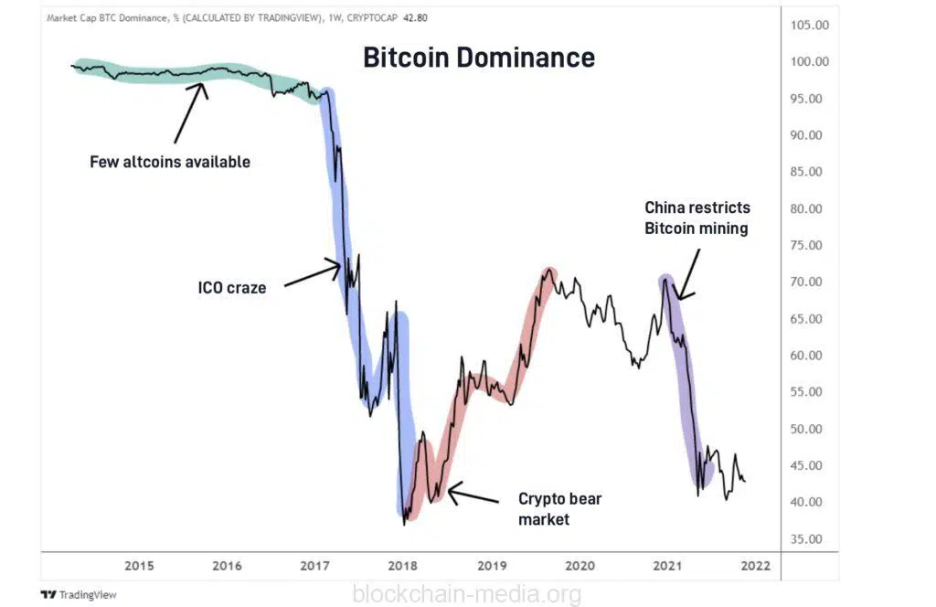 Бывают периоды, когда цена Биткойна имеет тенденцию к росту, что значительно увеличивает рыночную стоимость Биткойна. Аналогичным образом, бывают времена, когда инвестиции в альткоины растут быстрее, чем в биткоин.