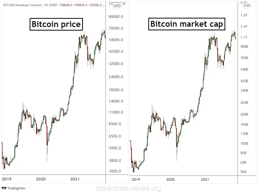Взаимосвязь между ценой биткоина и рыночной капитализацией можно увидеть на графике выше. Обратите внимание, что рыночная капитализация тесно связана с движением цены Биткойна. По мере роста цены Биткойна его рыночная капитализация имеет тенденцию к пропорциональному росту.