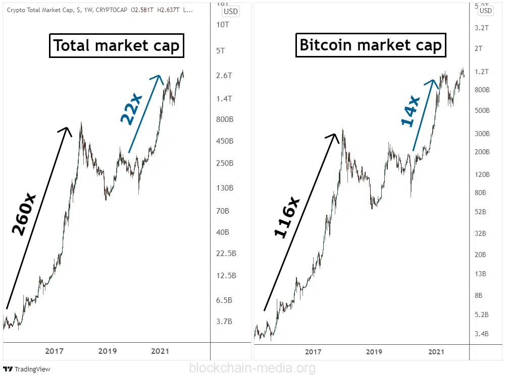На графике выше обратите внимание, что первая тенденция слева (черным цветом) намного больше и сильнее, чем соответствующий рост рыночной стоимости Биткойна справа. Это говорит о том, что коллективная оценка альткоинов растет быстрее, чем оценка Биткоина, а значит, альткоины оказывают сильное влияние на общую рыночную стоимость.