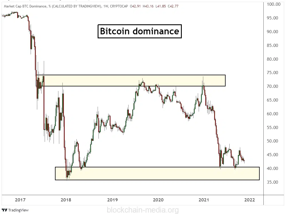 По определению, редко когда доминирование биткоина достигает таких исторических максимумов и минимумов. Однако, когда соотношение достигает экстремальных уровней, это может открыть хорошие торговые возможности. Однако важно управлять своим риском, поскольку известно, что соотношение пробивает эти исторические уровни.
