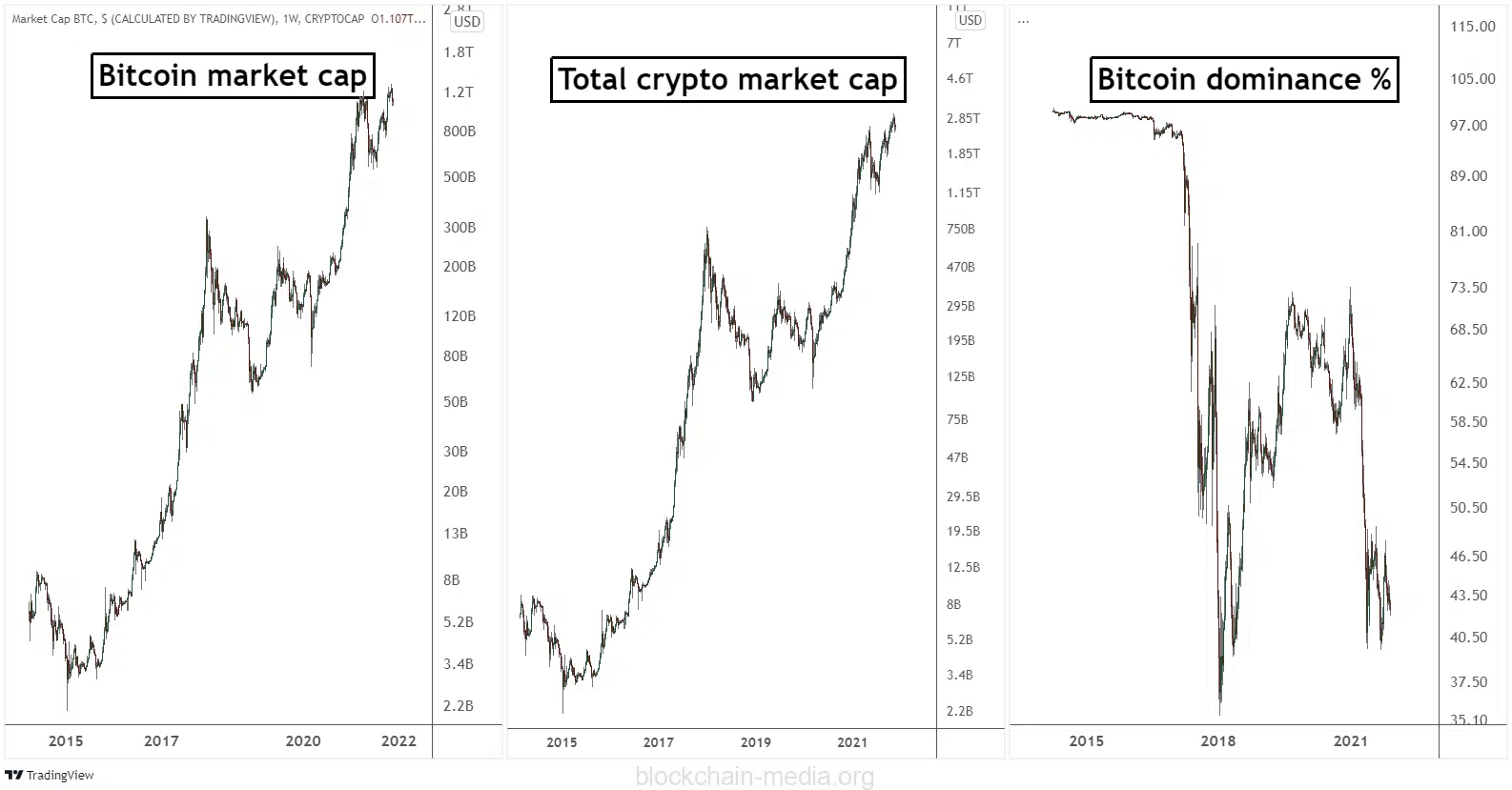 Определить и построить график обоих показателей, используемых в этом соотношении, несложно. Ниже мы видим рыночную долю биткоина (левый график), общую рыночную долю криптовалют (средний график) и доминирование биткоина (правый график).