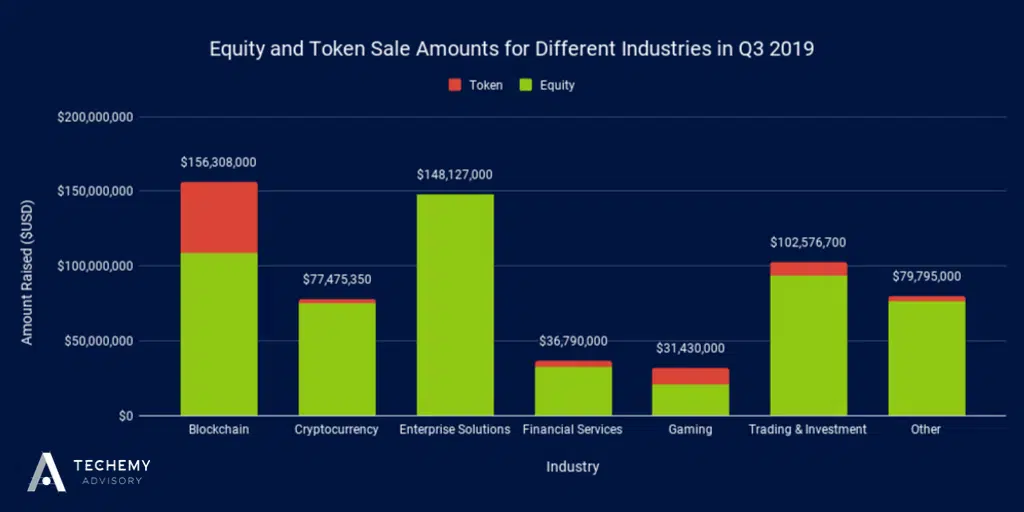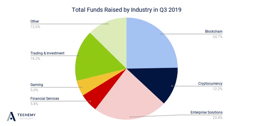 Несмотря на то, что значительная доля компаний в третьем квартале была распределена по разным отраслям и сгруппированы как «Прочие», они представляют только 12,6% от общего объема средств, привлеченных в третьем квартале, как показано на Рис. 2. Сектор блокчейна представлял чуть менее четверти всего привлеченного капитала, в то время как сектор торговли и инвестиций, сектор с наибольшим количеством компаний, занимающихся привлечением капитала, составляет всего 12,2% от всего привлеченного капитала. Как видно из рис. 3, 30% капитала, привлеченного в секторе блокчейнов, было связано с продажами токенов.