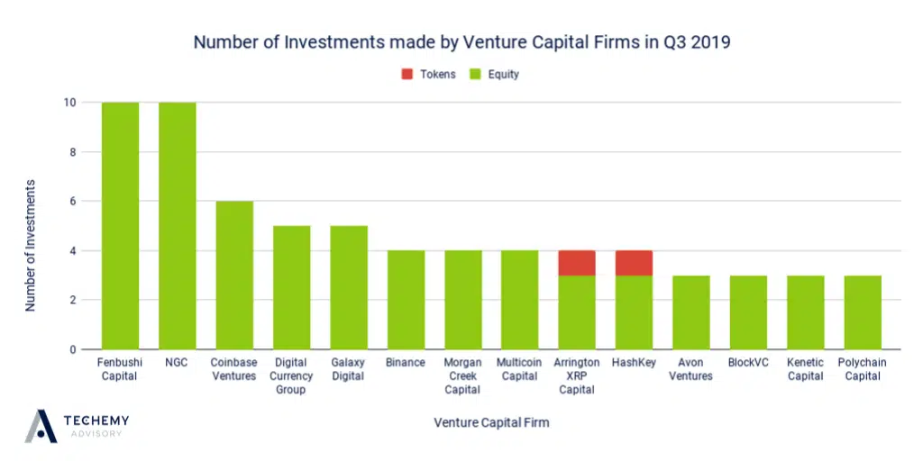 Было установлено, что несколько крупных инвесторов в блокчейн / криптоинвесторы сделали более одной инвестиции в третьем квартале 2019 года, как видно на рисунке 4, Fenbushi Capital и NEO Global Capital (NGC) сделали по десять инвестиций каждая, Coinbase Ventures осуществила шесть инвестиций, Binance, Morgan Creek Capital, Multicoin Capital, Arrington XRP Capital и HashKey сделали по четыре инвестиции в каждой. BlockVC, Kenetic Capital и Polychain сделали по три инвестиции в каждой.