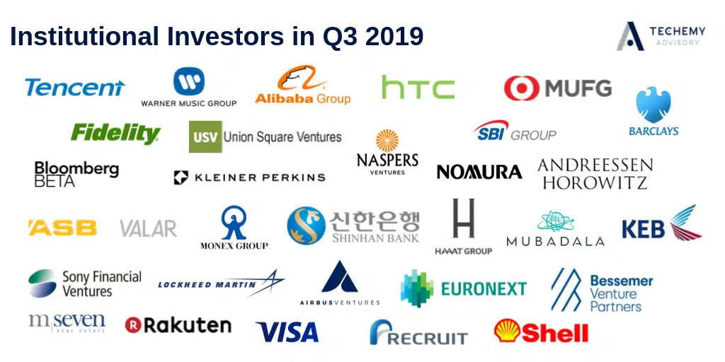 В третьем квартале 2019 года многие традиционные фирмы и учреждения венчурного капитала осуществляли инвестиции, как показано выше на рис. 5. Fidelity осуществила две инвестиции напрямую и три инвестиции через свою дочернюю компанию Avon Ventures. Фирмы венчурного капитала первого уровня, Andreeseen Horowitz и Kleiner Perkins, сделали по две инвестиции каждая, в то время как Nomura и Naspers Ventures также сделали по две инвестиции каждая.