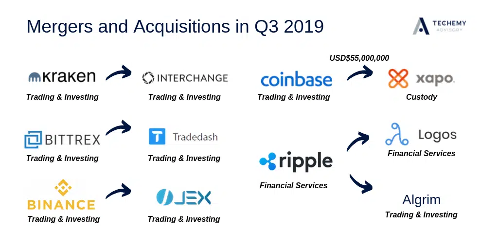 Как видно из рисунка 6, несколько крупнейших компаний в крипто-торговле были куплены в третьем квартале. Кракен приобрел Interchange, поставщика услуг по учету, сверке и отчетности для хедж-фондов криптовалюты, управляющих активами и администраторов фондов. Bittrex приобрел Tradedash, торговый инструмент, который предлагает клиентам настраиваемый торговый опыт. Binance приобрела JEX, платформу для торговли крипто-активами, предлагающую услуги спот и торговли деривативами. Ripples Xpring приобрела Logos Network, начинающую разработку платежных решений, ориентированных на скорость и масштабируемость, и Ripple приобрела Algrim, основанную в Исландии компанию по криптовалюте и опытного разработчика платформ криптовалюты.