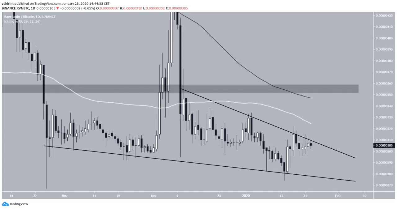Цена Ravencoin торгуется очень близко к области поддержки, окружающей его рекордно низкую цену в 275 сатоши. Эта область была катализатором быстрого восходящего движения, которое началось в феврале 2019 года.