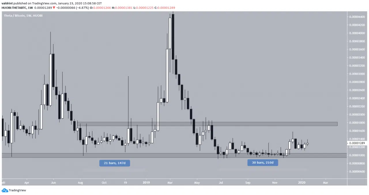 Аналогично RVN, цена THETA находится вблизи своего исторического минимума, который был на уровне 1000 сатоши. Текущее движение очень похоже на движение в августе-декабре 2018 года, когда цена консолидировалась за 147 дней до прорыва.
