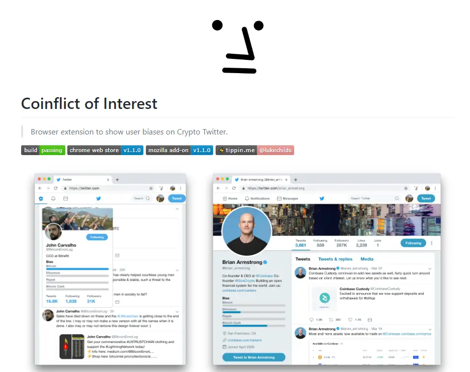 Новое расширение для браузера Chrome под названием Coinflict of Interst для криптовалютного сообщества Twitter направлено на то, чтобы выявить «предвзятость» в контенте о криптовалютах, загружаемом известными фигурами в социальную сеть.
