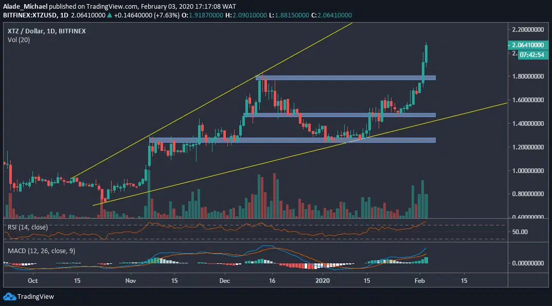 - После прорыва отметки в 2 доллара цена Tezos может достигнуть 2,5 долларов в течение нескольких дней, если покупатели продолжат проявлять интерес.