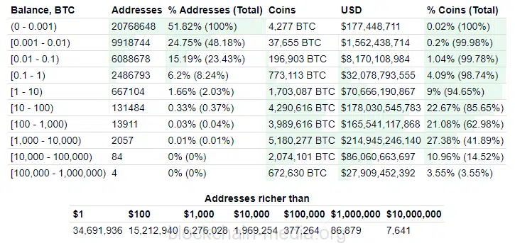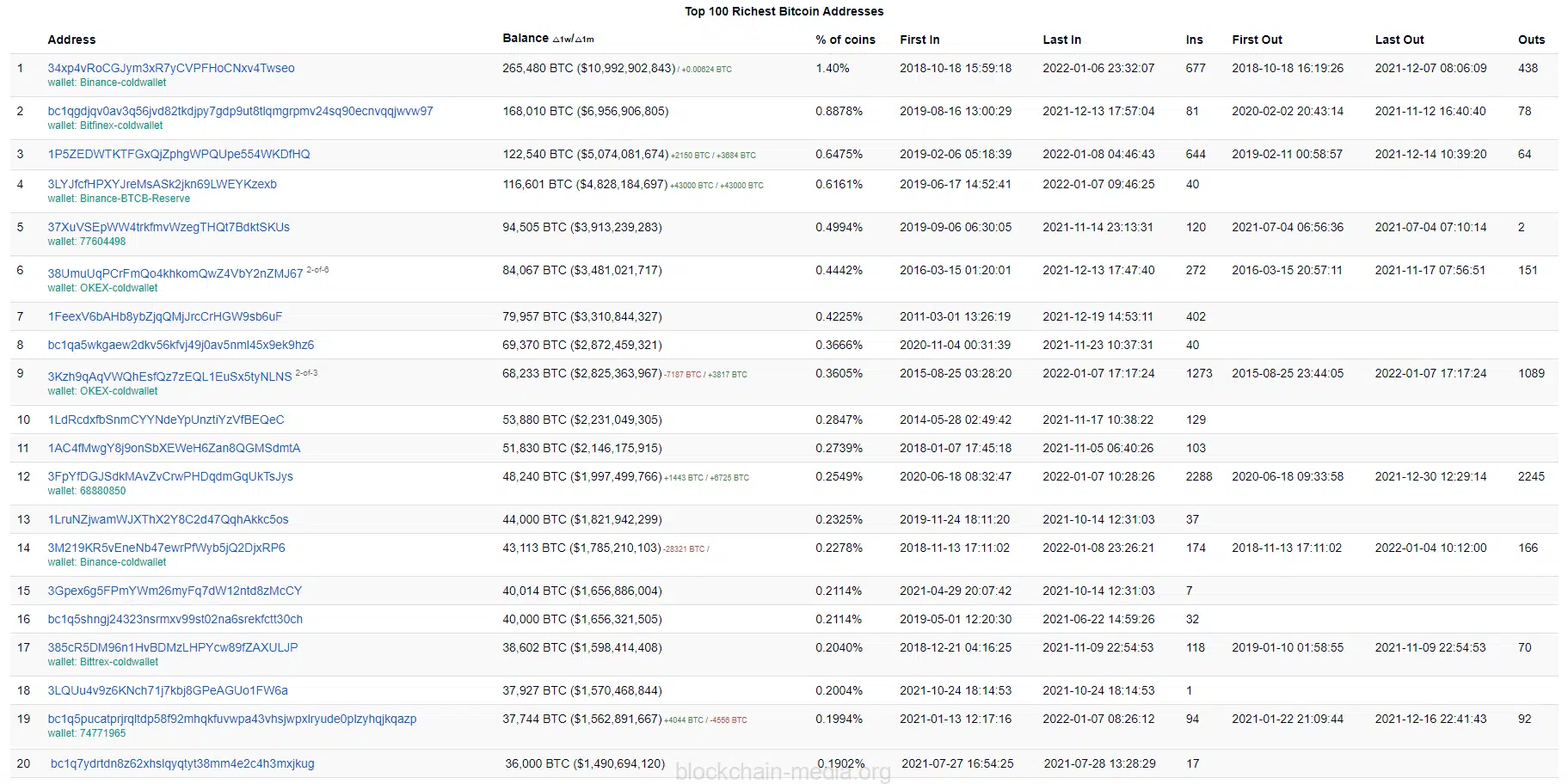 Владельца биткоина можно определить, посмотрев на адреса биткоинов, находящихся в обращении. На сегодняшний день существует всего три отдельных биткоин-адреса, на которых хранится более 100 000 BTC. Еще 83 владельца имеют от 10 000 до 100 000 BTC. На 87 самых богатых адресов приходится чуть более 14% от общего количества биткоинов в обращении.